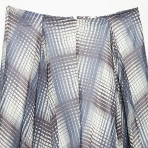 Design: High-waisted, mid-length, wide flowy silhouette with asymmetric hem