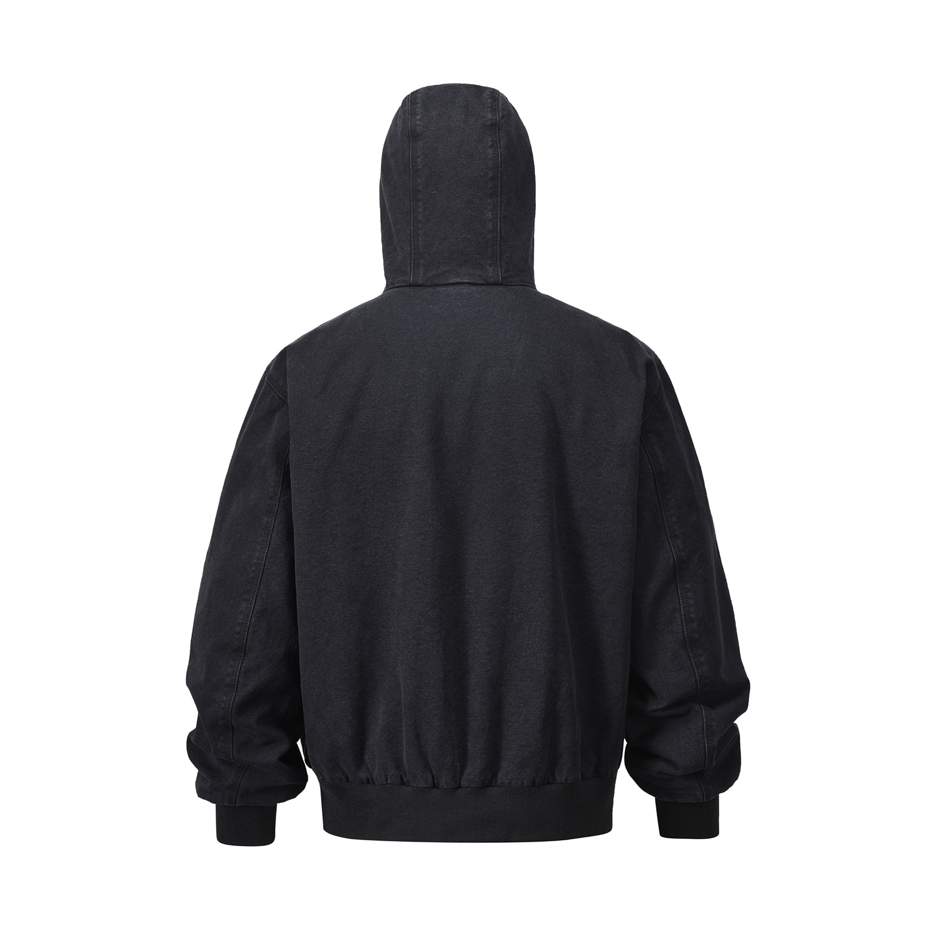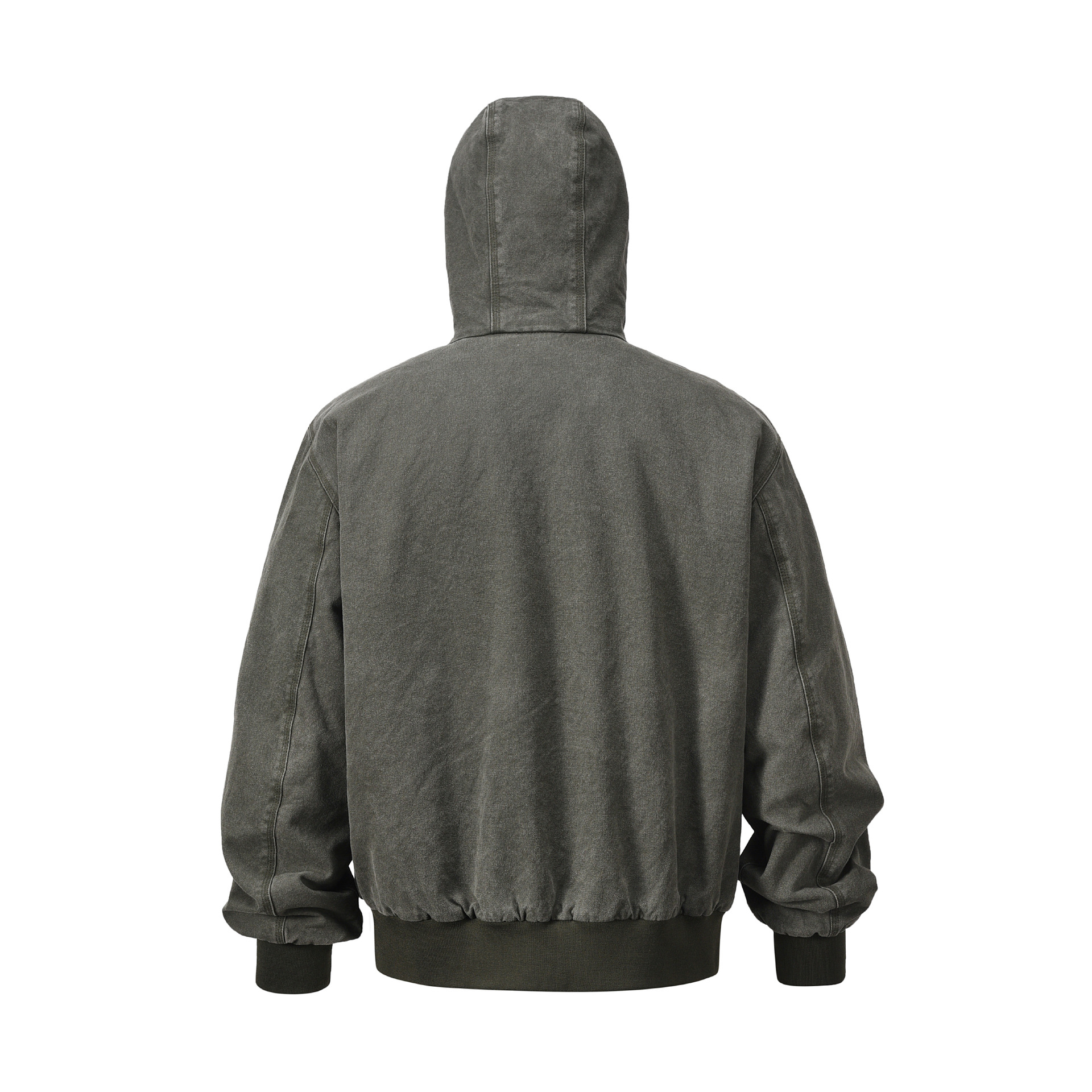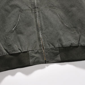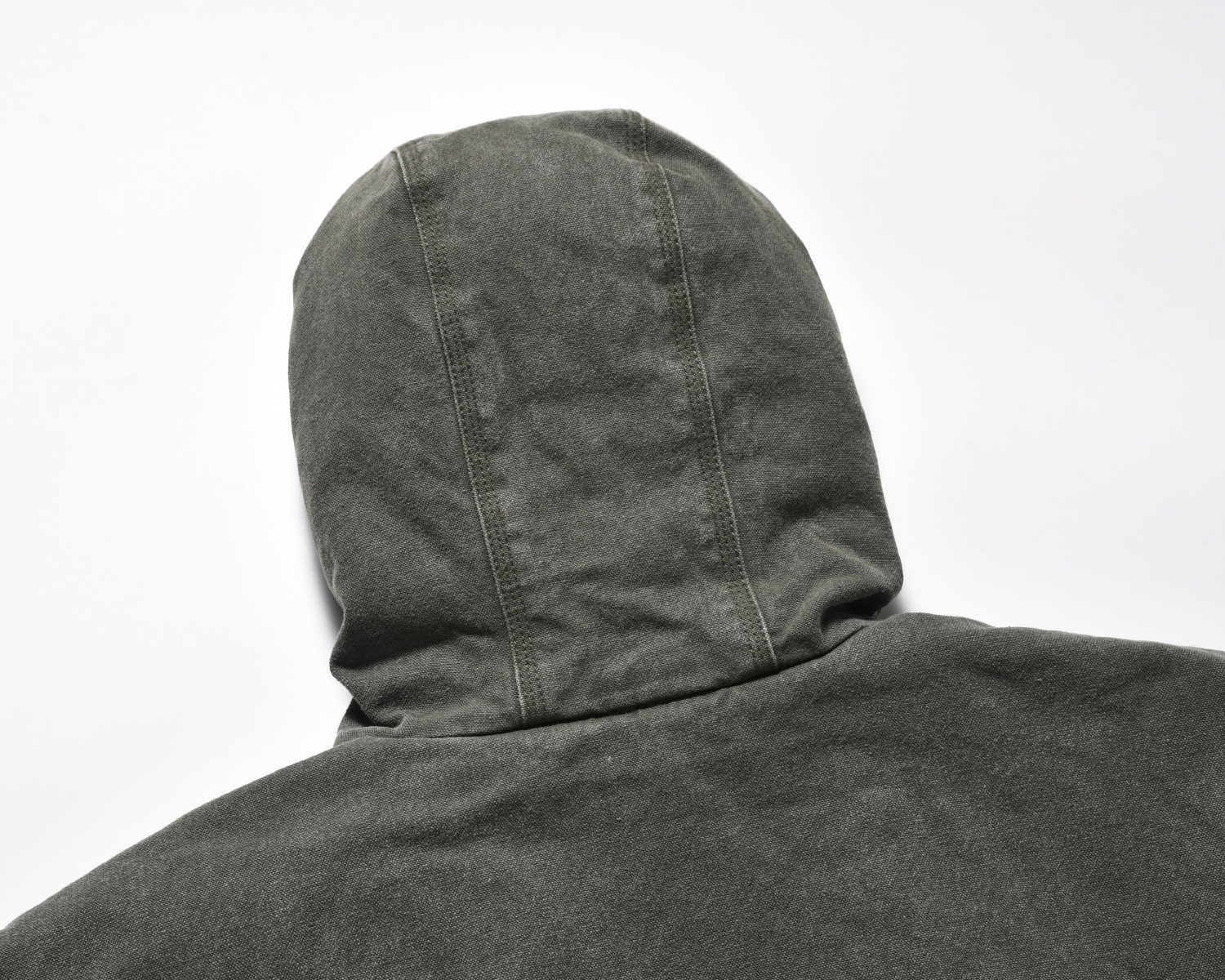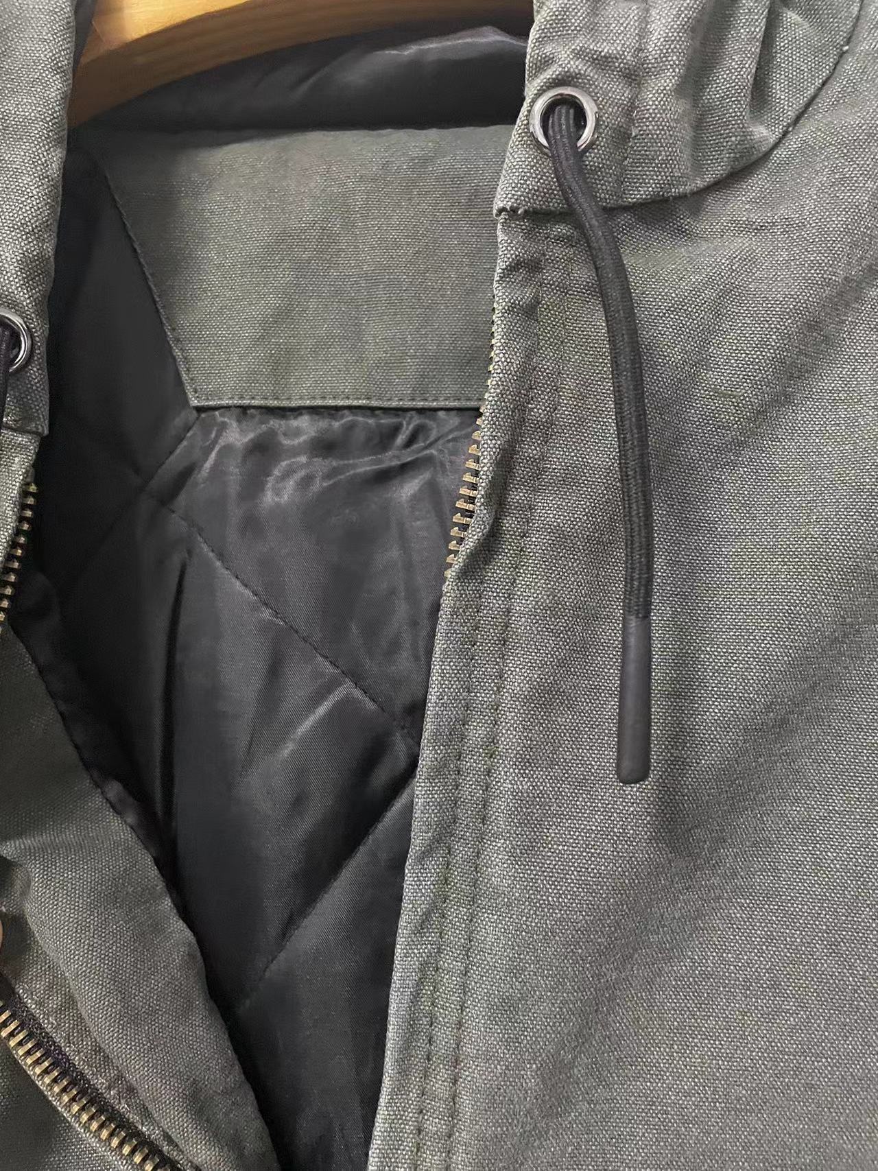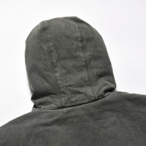 This hooded jacket features a washed finish for a natural vintage look and is padded with thick cotton for superior warmth. The adjustable drawstring hood offers added protection against wind and cold. Functional angled front pockets add everyday convenience, while the ribbed cuffs and hem help retain heat and structure. Perfect for transitional weather or layered winter styling, it’s an essential in any urban or utility-inspired wardrobe.